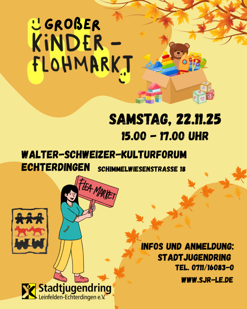 Am 22. 11 findet wieder unser beliebter Kinderflohmarkt von 15 bis 17 Uhr im Walter-Schweizer Kulturforum statt. Ab dem 20.10. könnt ihr euren Tisch buchen.
